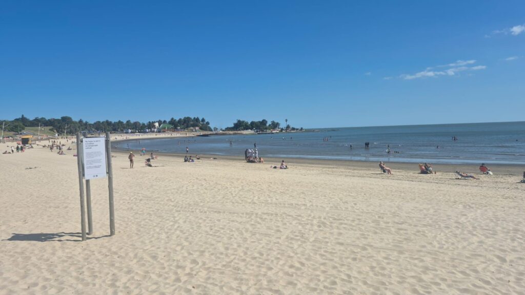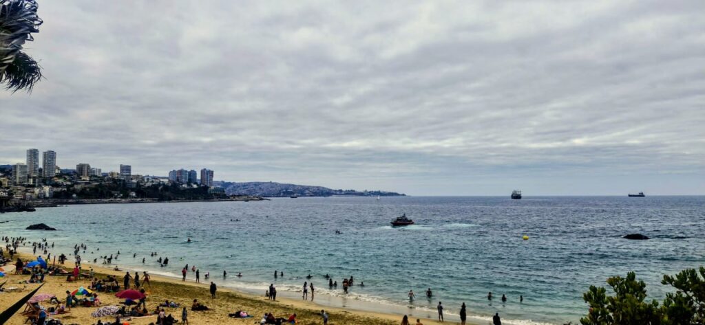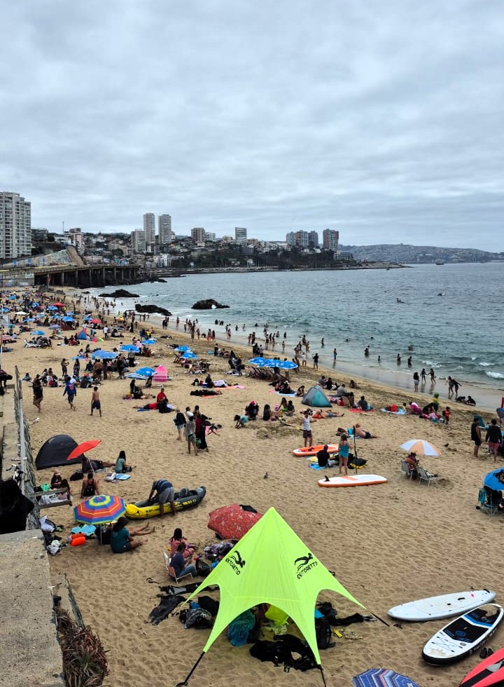 The beach was extremely crowded, and the Pacific Ocean water was cold, even though it was summer in the southern hemisphere.