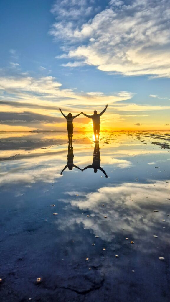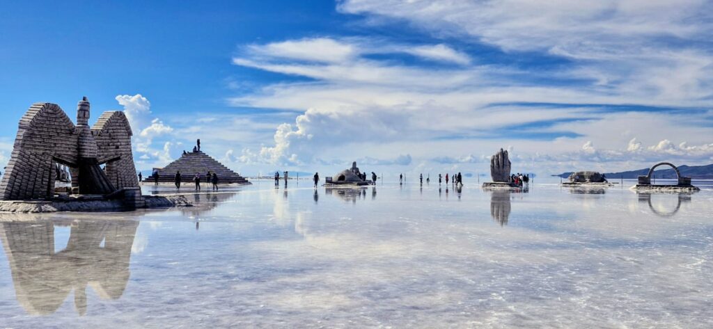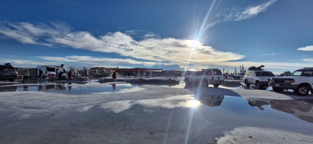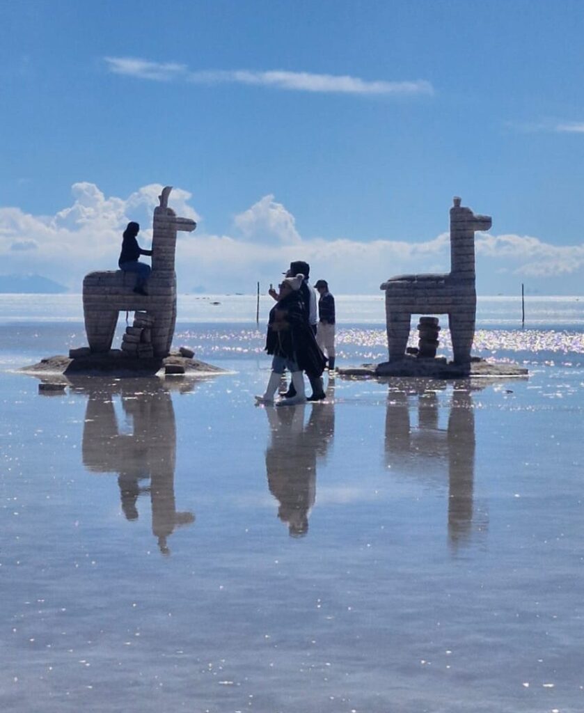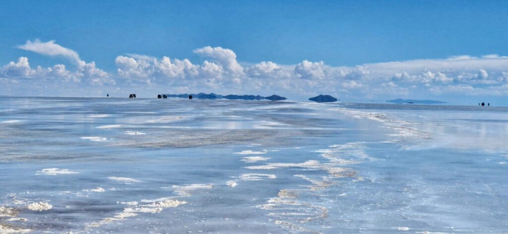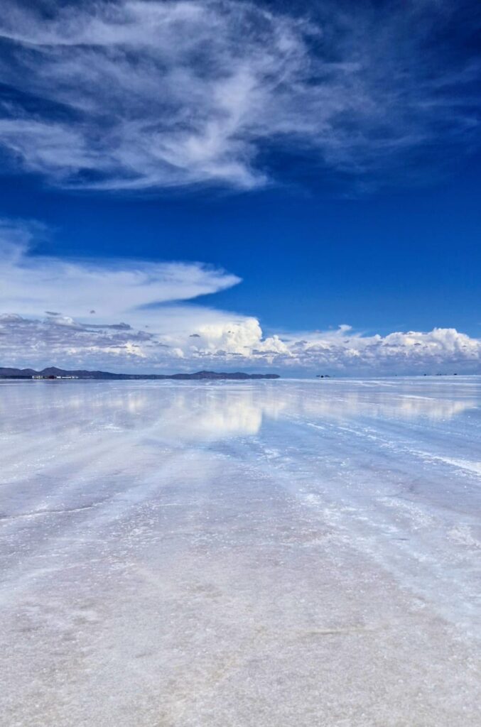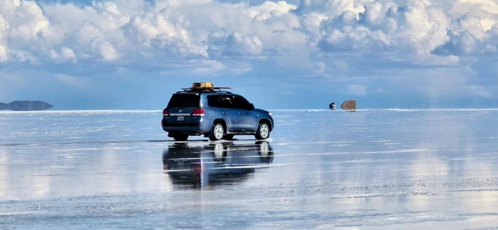 Because the water layer is so shallow, it is possible to drive or walk across it. Since the water is thin, there are no waves, and the white salt beneath acts like a mirror, creating stunning reflections.