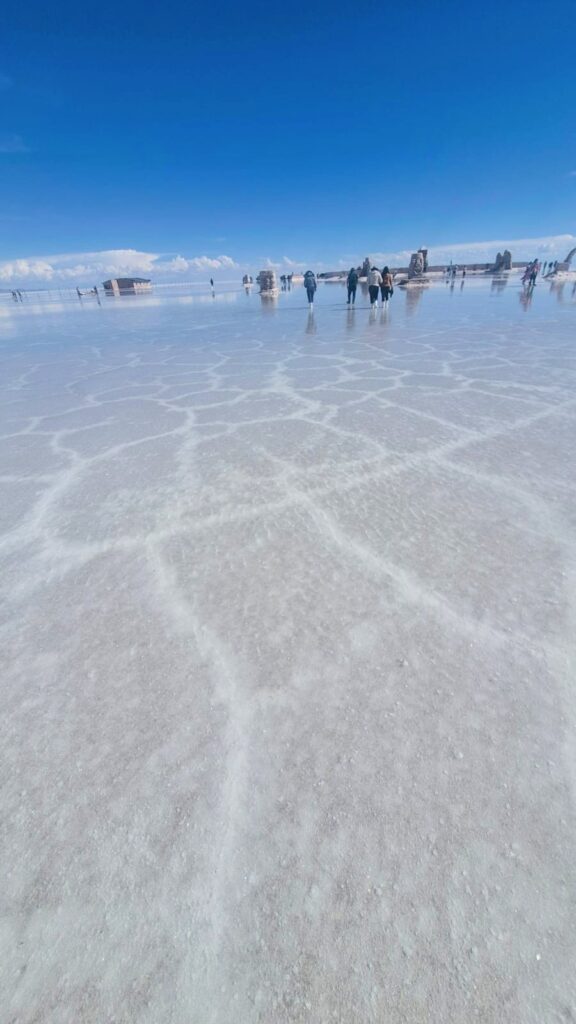 Instead of soil, the ground is covered entirely with salt. During the wet season, a thin layer of water — about 2 cm deep — sits above the salt crust.