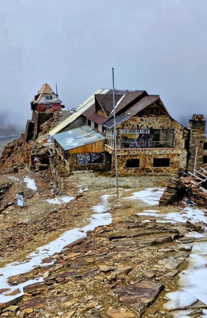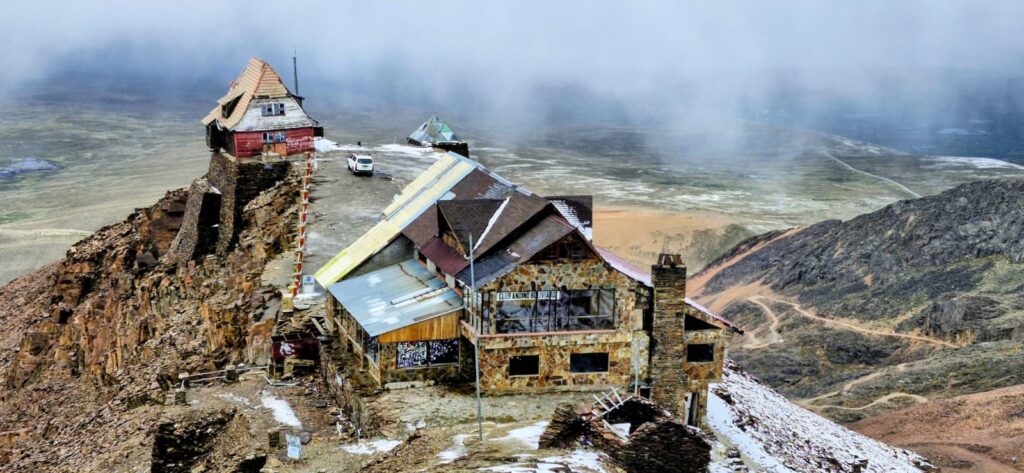 Near the top, there was quite a bit of snow. The vehicle parked at approximately 17,200 ft above sea level, near a lodge that sits in a beautiful location.