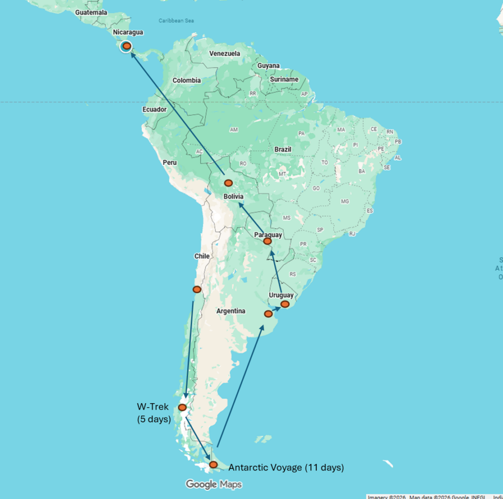 Between December 26, 2025 and January 31, 2026, we journeyed across Chile, Argentina, Uruguay, Paraguay, Bolivia, and Costa Rica on what turned out to be one of our most diverse and memorable trips. The adventure began in Chile on Dec 26–27, followed by the spectacular W-Trek in Patagonia from Dec 28 to Jan 3. We then set sail for our Antarctica expedition from Jan 8 to Jan 18, crossing the legendary Drake Passage and exploring the White Continent. Returning to South America on Jan 18, we continued onward through Argentina, Uruguay, Paraguay, Bolivia, and finally Costa Rica, wrapping up the journey on Jan 31 — a month filled with dramatic landscapes, vibrant cities, rich history, and unforgettable experiences. We had already visited Peru, Ecuador, Colombia, Brazil, Panama in the past, so we did not visit those countries this time.
