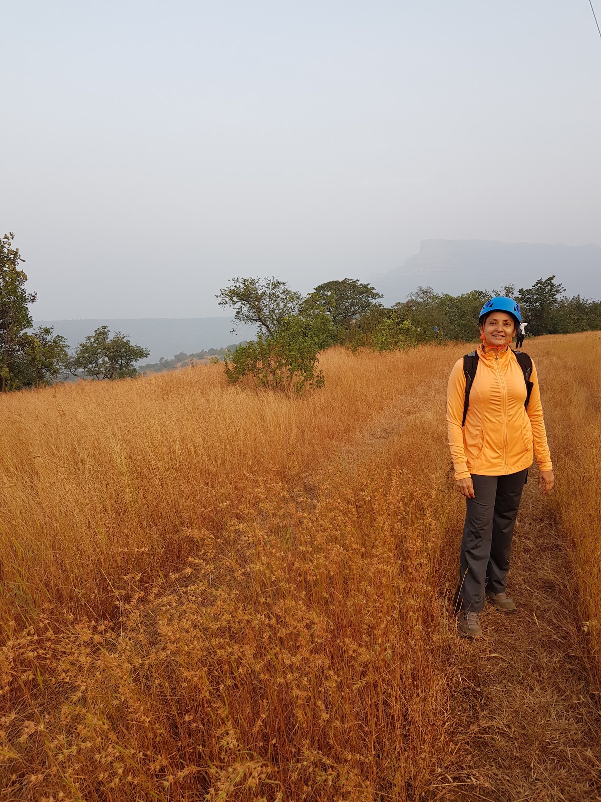 We walked for 1.5 hours to reach the point at which we were to start rappelling. It was a slightly downhill trek. The weather was beautiful. Not a cloud in the sky and cool December weather in Pune.