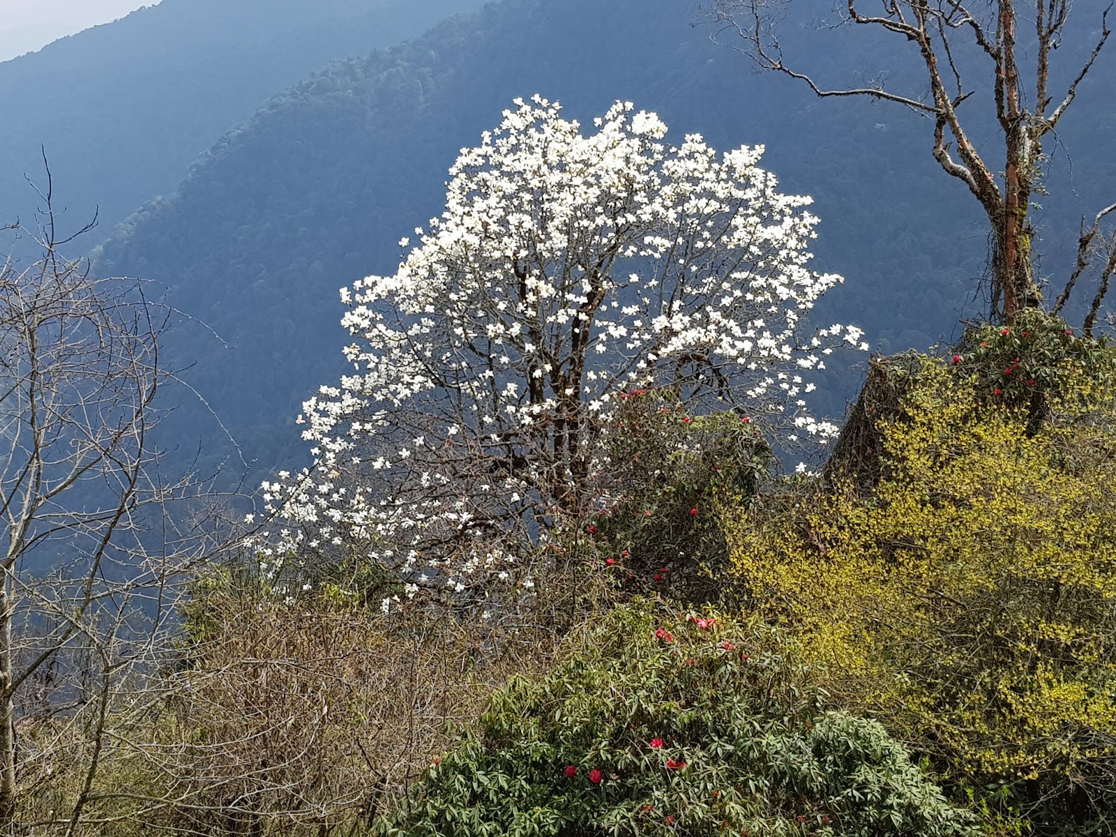 We arrived in Tsoka around 2 pm. Again about a 5 hour climb, but with a significant altitude gain. We saw lots of Rhododendrons (red, pink) as well as a tree laden with white flowers.