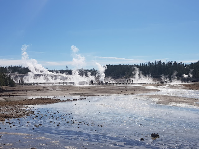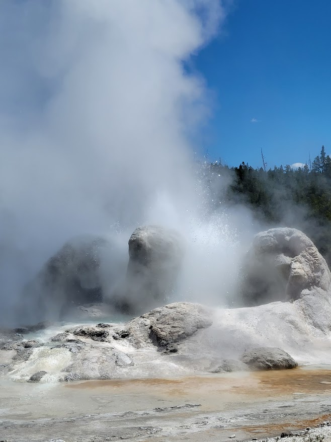 We started by going to Old Faithful. Old Faithful is a cone geyser in Yellowstone National Park in Wyoming, United States. It was named in 1870 during the Washburn–Langford–Doane Expedition and was the first geyser in the park to be named. It is a highly predictable geothermal feature and has erupted every 44 minutes to two hours since 2000. The expected eruption timing is posted on a board. We were lucky to arrive 5 mins before it erupted at around 12.40 pm.