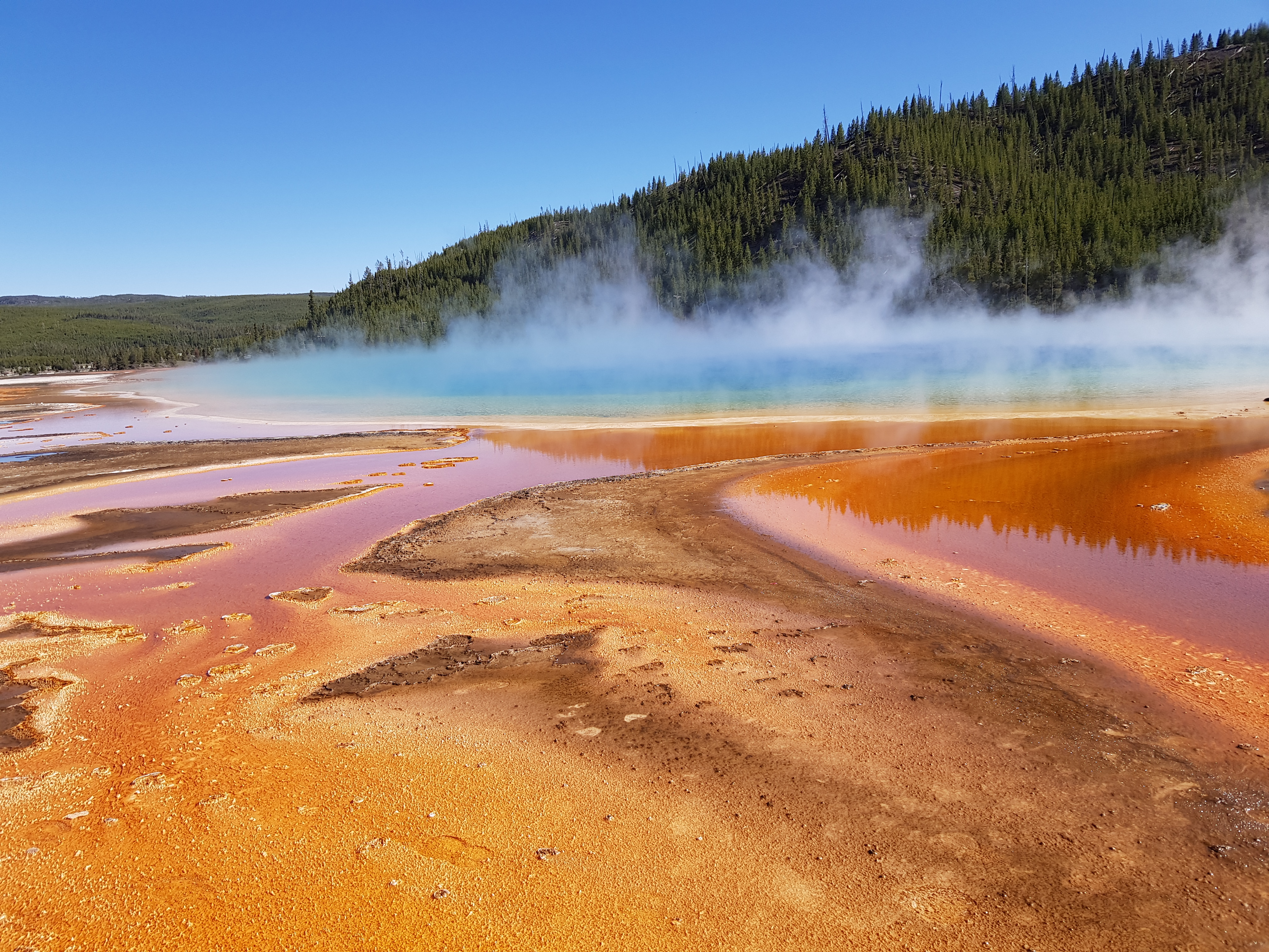 We also visited the Grand Prismatic Spring. The Grand Prismatic Spring in Yellowstone National Park is the largest hot spring in the United States, and the third largest in the world after Frying Pan Lake in New Zealand and Boiling Lake in Dominica. It is located in the Midway Geyser Basin.